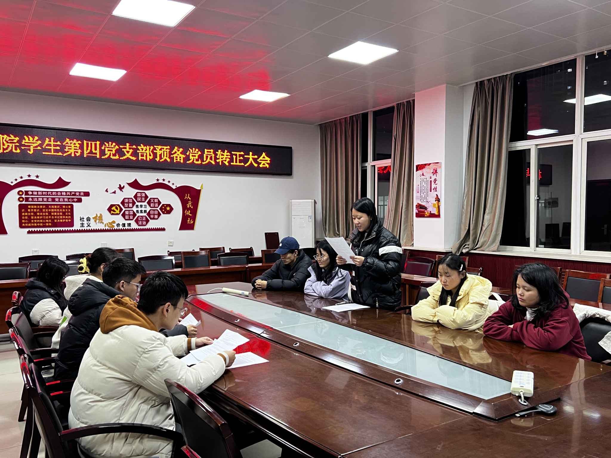 学生第四党支部在工3-410隆重召开预备党员转正大会,会议严格按照党组织发展程序规范开展,支部全体党员参会,会议由党支部书记主持。