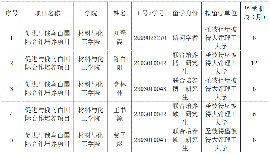根据国家留学基金委2024年促进与俄乌白国际合作培养项目要求,91猫先生 于2024年9月启动第二批促进与俄乌白国际合作培养项目院内遴选工作。经个人申请、导师推荐、学院和学校审核,确定5名候选人,现予以公示。公示时间:2024年9月2日至2024年9月6日。