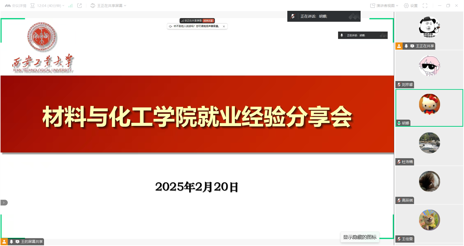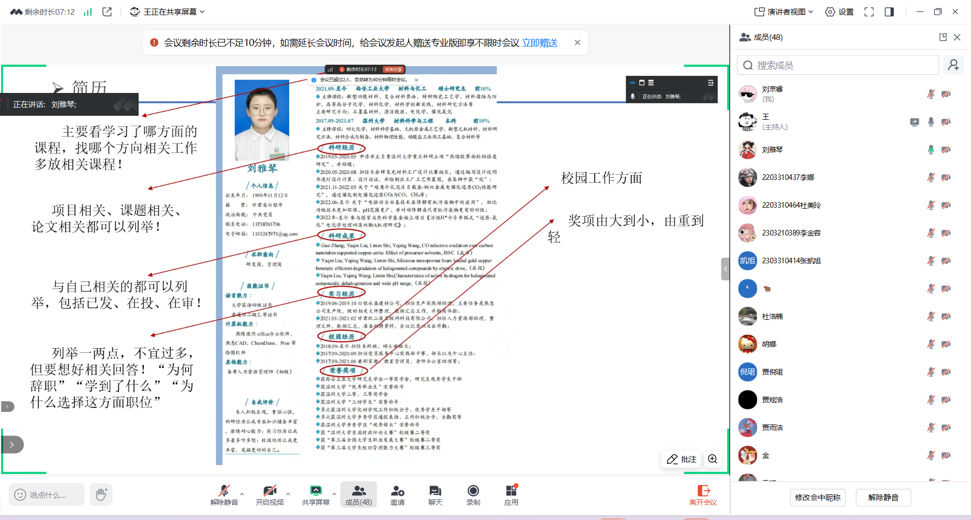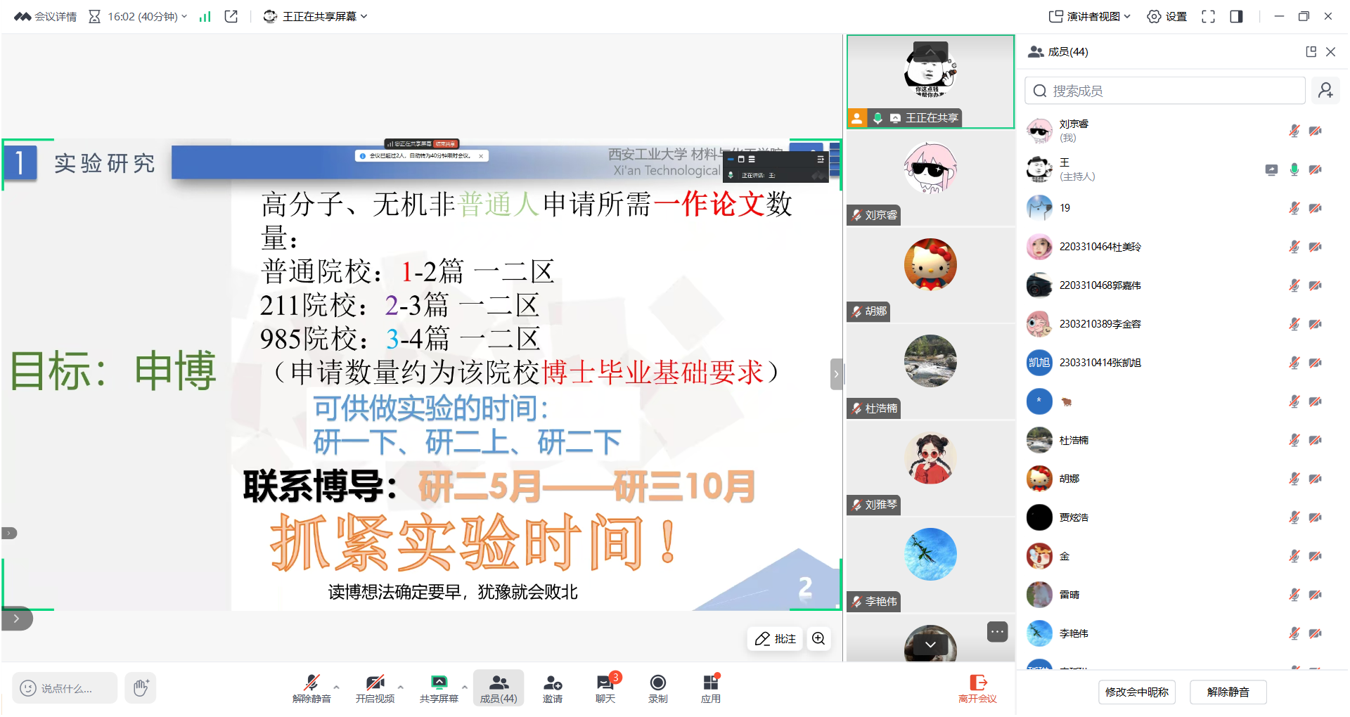 召开线上优秀毕业生就业经验分享会,邀请学院2024届优秀硕士毕业生王伟和刘雅琴分享升学和就业经验,学院研究生辅导员胡娜、全体硕士研究生参加会议。