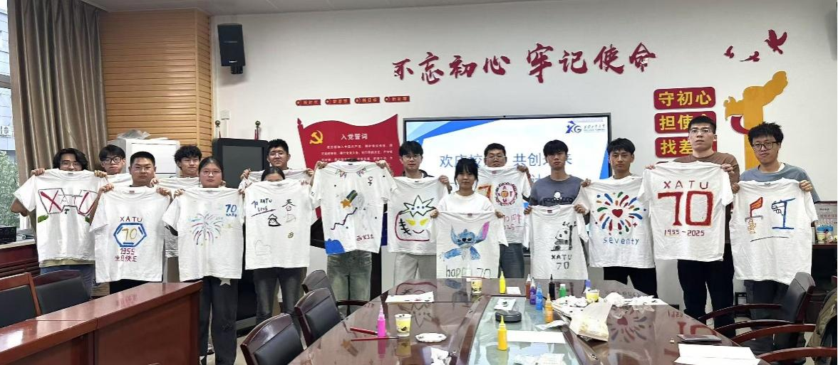 活动伊始,辅导员张启妍鼓励同学们充分发挥自身创意和想象力,以手中的画笔书写对母校的感情。随后,同学们以纯白色T恤为画布,紧扣“70周年校庆”主题,使用画笔和颜料在T恤衫上通过绘画、涂鸦、文字等创意形式,表达对学校的祝福和对未来的展望。色彩斑斓的图案与文字,让每一件T恤都承载着学子们对学校的深情厚谊。作品展示环节,张启妍对同学们的精彩表现与创作成果予以肯定,点评了每件作品的独特之处,赞扬同学们巧用创意元素,展现爱校情怀。