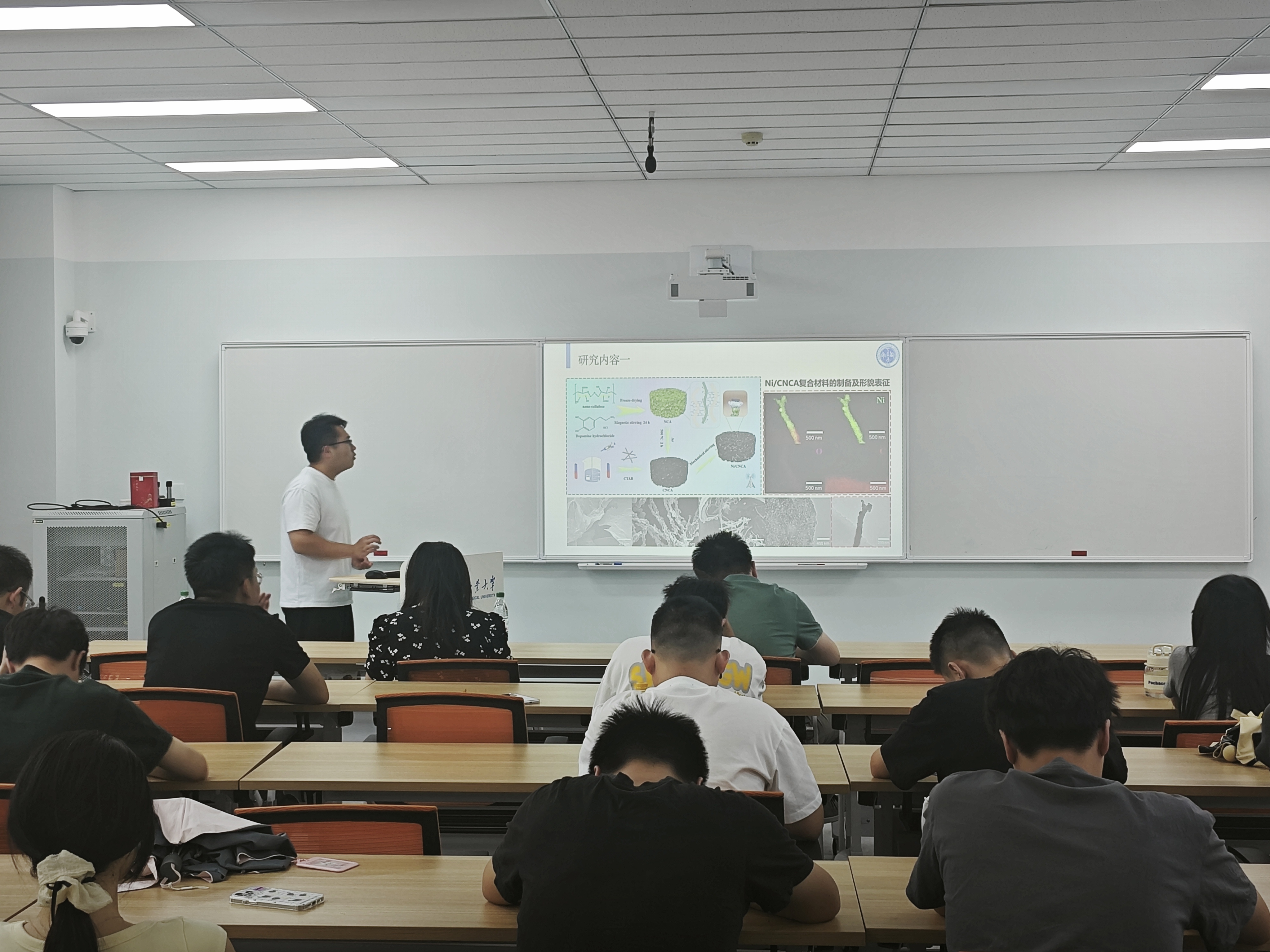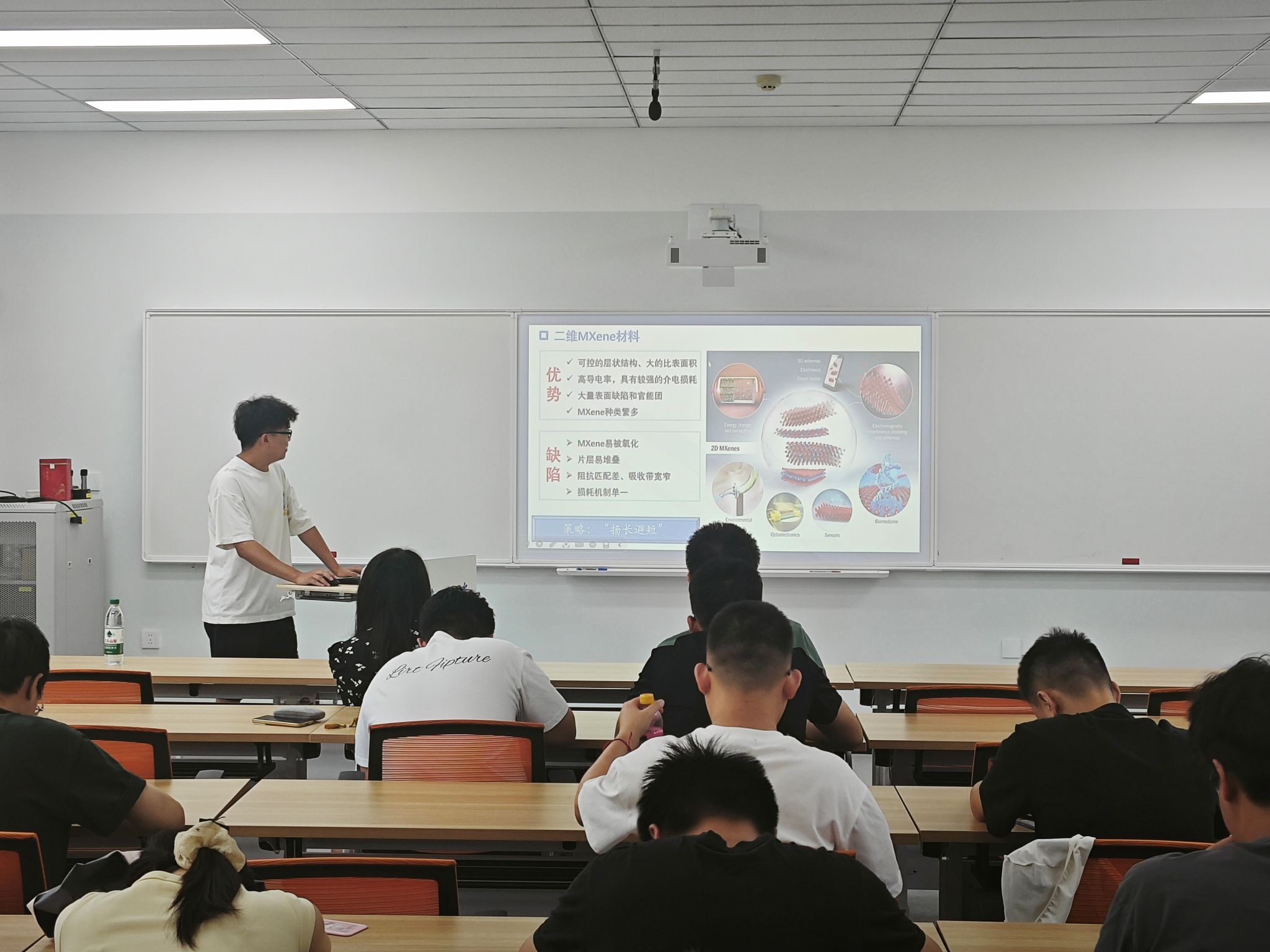 学术分享环节中,四位优秀的硕士生代表依次带来精彩的学术分享。陈亦坤同学以“多界面的Fe7S8/NiS@C复合材料用于宽带微波吸收”为题,分享了MOFs衍生材料在微波吸收领域的创新成果;裴瑞峰同学围绕“阴离子掺杂触发缺陷调制介电耦合的超薄微波吸收材料研究”,探讨生物质基材料的独特性能与应用潜力;王博洋同学就“多功能轻质磁性纤维素基气凝胶的集成设计:用于高效微波吸收的1D/2D/3D分层网络”,介绍纤维素基复合材料的制备及吸波性能;饶辉超同学以“通过自分解策略调控银耳状多维异质结构的电磁响应能力”为主题,阐述MXene基复合材料的微结构设计与吸波性能优化。