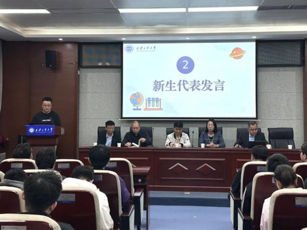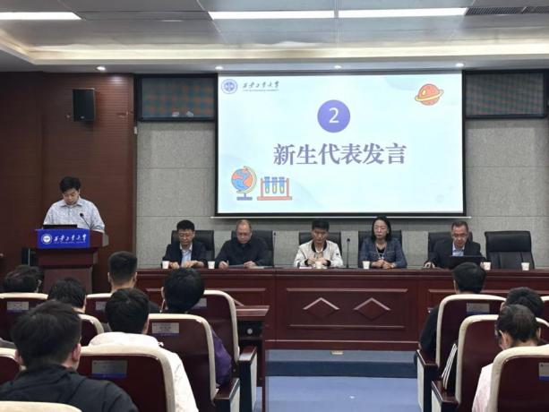 会议伊始,院长杨忠发表致辞。他指出,材料科学与工程学科是支撑国家“制造强国”战略的核心领域,学院始终以服务国家需求为导向发展学科。同时他对新生提出三点期望:一是要树立“问题导向”的学术思维,聚焦材料合成、新能源材料等领域的“卡脖子”难题深耕细研,让科研成果真正服务产业需求;二是要涵养“协同协作”的团队意识,主动依托导师科研团队、学院跨学科平台,在思想碰撞中突破创新边界;三是要胸怀“开放包容”的国际视野,积极把握国际交流机遇,以全球视角对标学术前沿,未来既能“扎根中国大地做研究”,也能“站在世界舞台发声”,为学院学科发展、为国家材料化工领域进步注入新生力量。