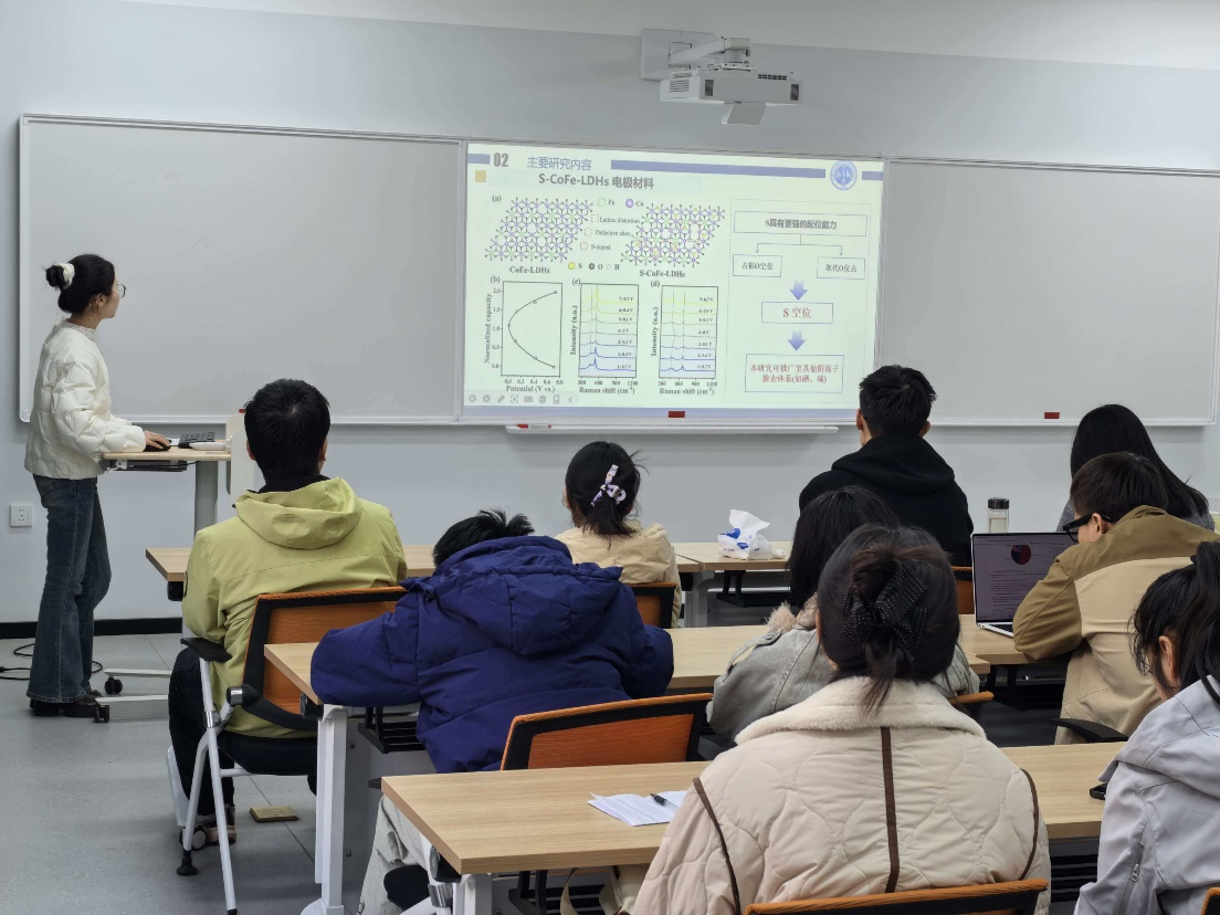 学术分享环节中,2023级博士贾冰喆分享特种环氧胶黏剂研发进展,通过树脂改性、填料功能化等技术突破耐温、环保等瓶颈,满足高端制造领域轻量化、高可靠性需求;2024级博士强欣瑞围绕LDHs电极材料,介绍通过中空结构构建与阴阳离子掺杂策略提升导电性及电化学性能的研究成果,为新型储能材料研发提供思路;2023级硕士张龙艳则分享Al、P协同掺杂调控MoS₂导电性与电容的研究,其组装的非对称超级电容器展现出优异的能量密度与循环稳定性,为过渡金属硫化物储能器件研究奠定基础。