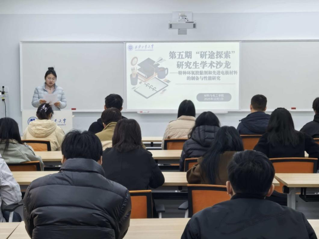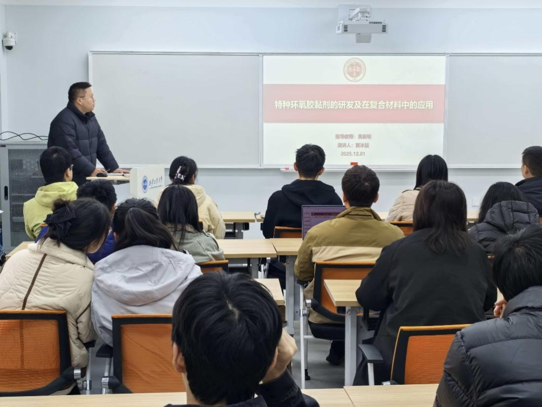 于12月1日举办第五期“研途探索”研究生学术沙龙活动。本期活动聚焦“特种环氧胶黏剂和先进电极材料的制备与性能研究”主题,特邀吴新明教授、罗春燕副教授担任点评嘉宾。活动由研究生辅导员张启妍主持,辅导员胡娜与学院五十余名研究生参与,现场学术氛围浓厚。