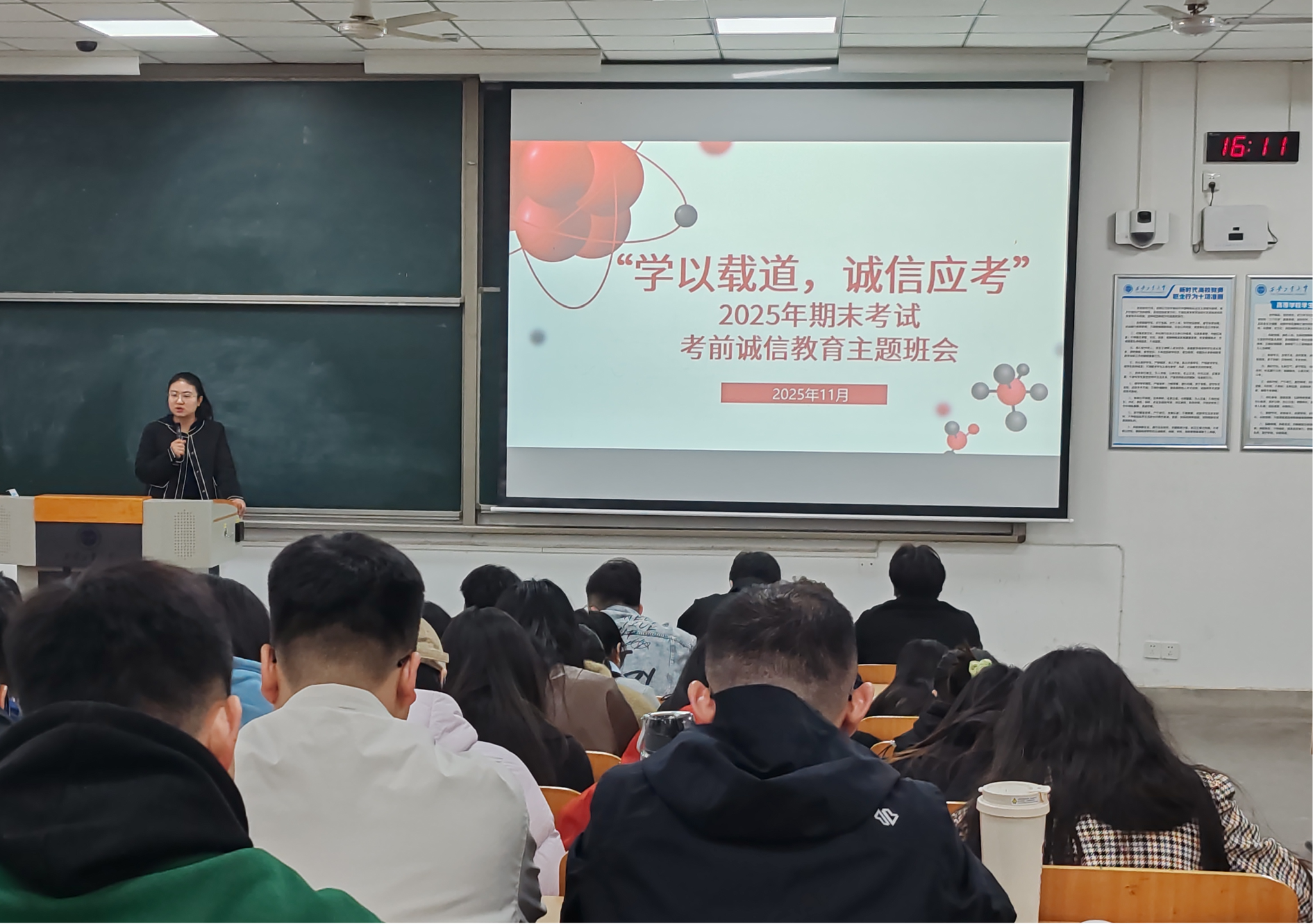 于2025年11月28日在教1-201召开2025年秋季学期考前诚信教育年级大会。会议由研究生辅导员张启妍主持,学院全体研究生参会,以案例警示、政策解读的形式,为期末备考划清纪律红线、筑牢思想防线。