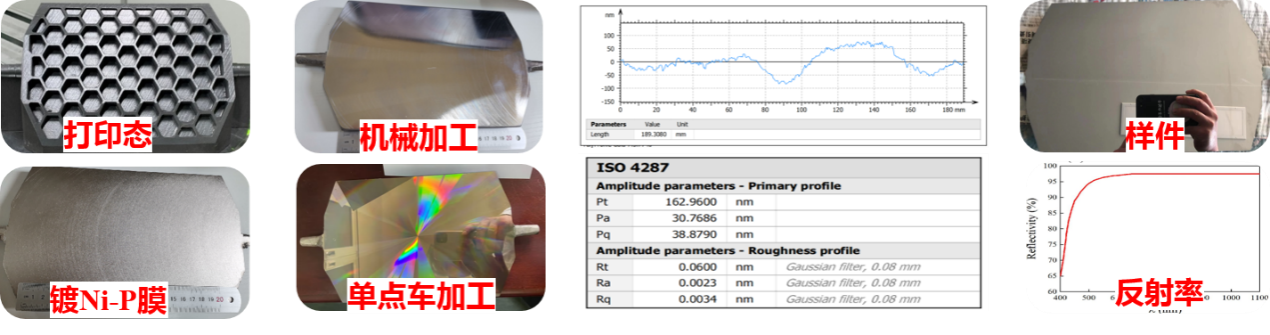 采用SLM技术制备出了低膨胀高弹性模量铝合金 (密度ρ<2.8 gcm-3、弹性模量E≥90 GPa、比刚度E/ρ>32 GNm-1g-1、热导率λ≥135 Wm-1K-1、线热膨胀系数α≤18×10-6 K-1、热稳定性λ/α≥7.5)。在反射镜、电子封装等领域进行了产业化开发,已开发出近全致密组织的镜面尺寸为258 mm×165 mm的铝合金轻质反射镜样件。